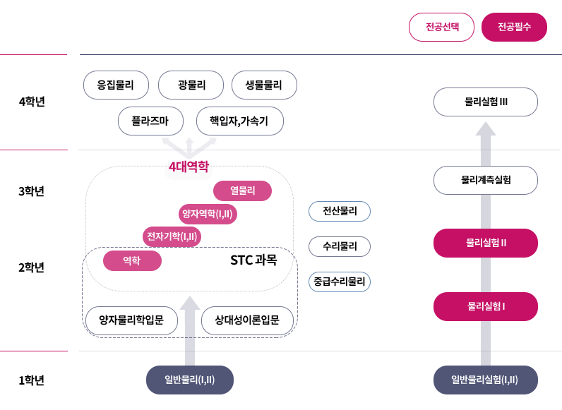 물리학과의 학부과정은 대학원에서 계속 물리학을 전공하고자 하는 학생들 위주의 전통적인 물리학 교과과정을 탈피하여, 물리분야 뿐만 아니라 타 분야로 진출하고자 하는 학생들도 물리학의 방법론을 익힐 수 있도록 교과과정을 마련하였습니다.